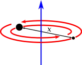 | Two point masses, m1 and m2, with reduced mass μ and separated by a distance x, about an axis passing through the center of mass of the system and perpendicular to the line joining the two particles. | ![]() |