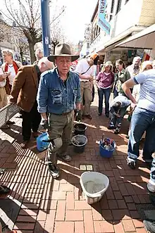 Gunter Demnig placing stolpersteine on the main road in Frechen, 3 April 2009