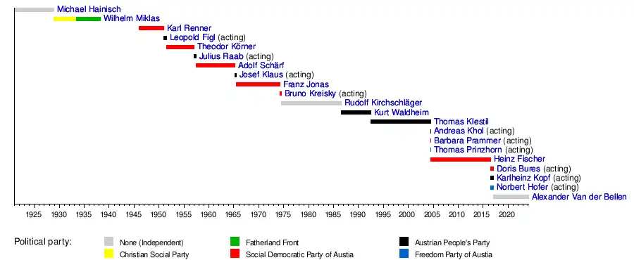 | Alexander Van der Bellen (born 1944) | 26 January 2017 | Incumbent | 6 years, 355 days | Independent Greens | 2016 2022 | ||