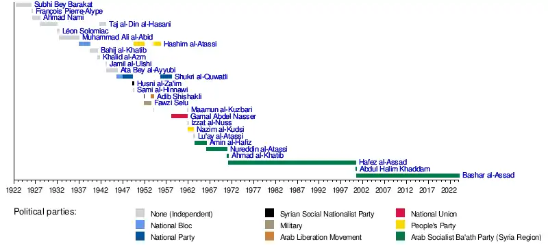 Bashar al-AssadAbdul Halim KhaddamHafez al-AssadAhmad al-KhatibNureddin al-AtassiAmin al-HafizLu'ay al-AtassiNazim al-KudsiIzzat al-NussGamal Abdel NasserMaamun al-KuzbariFawzi SeluAdib ShishakliSami al-HinnawiHusni al-Za'imShukri al-QuwatliAta Bey al-AyyubiJamil al-UlshiKhalid al-AzmBahij al-KhatibHashim al-AtassiMuhammad Ali al-AbidLéon SolomiacTaj al-Din al-HasaniAhmad NamiFrançois Pierre-AlypeSubhi Bey Barakat