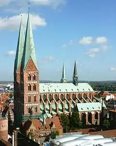 34Lübeck Cathedral 114.7 m (376 ft)1341Lübeck GermanyLutheran53°51′39″N 10°41′06″E / 53.860756°N 10.684901°E / 53.860756; 10.684901 (Lübeck Cathedral) Fifth-tallest twin tower façade; earliest of the brickwork churches on the Baltic Sea