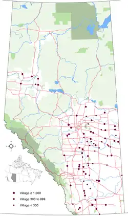 A village is an urban municipality status type used in the Canadian province of Alberta. Alberta villages are created when communities with populations of at least 300 people, where a majority of their buildings are on parcels of land smaller than 1,850 m2, apply to Alberta Municipal Affairs for village status under the authority of the Municipal Government Act.[1] Applications for village status are approved via orders in council made by the Lieutenant Governor in Council under recommendation from the Minister of Municipal Affairs.[1]