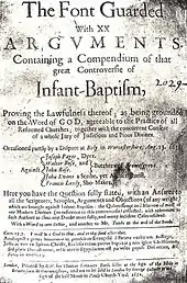 It is in the mid 17th century that the first evidence of a distinctive and sustained literary culture emerges within Birmingham, based around a group of writers working at the heart of the town's growth as a centre of religious puritanism and political radicalism. John Barton, the headmaster of King Edward's School, was the author of The Art of Rhetorick in 1634 and The Latine Grammar composed in the English Tongue in 1652,[7] but is best known for Prince Rupert's burning love for England, discovered in Birmingham's flames – a widely circulated, influential and vitriolic anti-Royalist tract that documented the sacking of the town by Prince Rupert of the Rhine at the Battle of Birmingham of 1643.[8] Anthony Burgess wrote numerous sermons and theological works while the rector of Sutton Coldfield between 1635 and 1662, entering into a prolonged if amicable theological dispute in print with Richard Baxter that culminated in a face-to-face debate in Birmingham in September 1650.[9] Francis Roberts was similarly prolific during his tenure as vicar of Birmingham's St Martin in the Bull Ring, with many of his works of popular or scholarly theology becoming nationally known and running through numerous editions.[10] Thomas Hall was the master of the King's Norton Grammar School from 1629, and the minister of the adjacent St Nicolas' Church from 1650, but from the 1630s onwards was drawn into the radical circles of nearby Birmingham. He was the author of a long series of polemical works, combining both populist and erudite writing on religious and social matters.[11] His 1652 volume The Font Guarded – a defence of the practice of infant baptism – was the first book known to have been published as well as written in Birmingham, and provides the first definite evidence of booksellers operating within the town.[12] Between 1635 and 1642 Roberts, Hall and Barton were involved in establishing the first Birmingham Library, one of the earliest public libraries in England.[13]