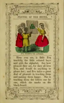 A prominent theme in the book is education during the slave period in the United States. The portrayal of Little Eva as an educator was first popularized by an illustration in the first edition of Uncle Tom's Cabin.[26] In the image, Little Eva engages in a "a pedagogical exchange with Tom",[27] which displaced the novel's description that he was her "confidant rather than pupil".[28] This idea was further expanded on by children's literature writers, like Cozans, and illustrators.[27] Stowe connected Little Eva with education in a more limited way,[28][29] by writing how she advised slaves to convert to Christianity and attend Bible readings whenever possible.[28] Unlike Cozans' book, in Uncle Tom's Cabin, Little Eva does not organize classes for slaves.[29][lower-alpha 6]