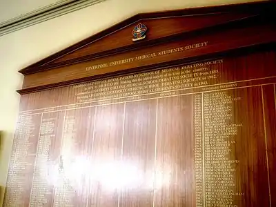 - ↑ "Archive of the University of Liverpool: Guild of Students, Student Societies and Student Life: Student Societies: Records of Individual Societies/Clubs: Medical Students' Society". University of Liverpool. Retrieved 5 November 2016.