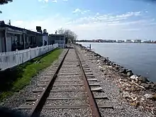 The station was abandoned on March 31, 1953, along with the South Beach Branch and the rest of the North Shore Branch.[7][11] Currently, the station site is occupied by an employee parking lot for the Con Edison facility located across the street.[6][8][17] Just east of the site is a restaurant, R.H. Tugs, which sits adjacent to the tracks.[18] The restaurant closed in August 2011 after 25 years of operation, reopening as Blue Restaurant.[8][19][20] The northern of the line's two tracks has been taken up, and due to coastal erosion of the line's retaining wall, part of the trestle has slid into the Kill Van Kull along with some of the trackage east and west of here.[5][13] Livingston is one of the stations to be returned to operation under the proposals for reactivation of the North Shore branch for rapid transit, light rail, or bus rapid transit service. Under the proposal, the right-of-way would be moved from the coastline to the parking lot site.[5][6][12]