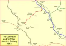 The Llantrissant and Taff Vale Junction Railway was incorporated by Act of 7 June 1861; it was to acquire the Llantwit Vardre Railway; capital was set at £40,000, and the Company could arrange for the Taff Vale Railway to work its line.[4][3][6]