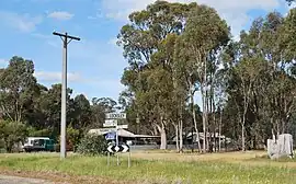 Locksley was initially part of Henry Kent Hughes' Avenel pastoral station, taken up in the 1830s and early settlement occurred along Burnt Creek and the hills of Teneriffe. A Cobb & Co coach service along the Sydney to Melbourne road was established with a horse changing station at Barlow's Lagoon, about a mile from Locksley. The Locksley railway station opened in 1882 as Burnt Creek, (changing its name the following year as there was another station of that name in Victoria), with sidings serving up to five sawmills, which were supplying fire wood to Melbourne, and a local hall was built in 1887.[3][4] In the summer of 1901 a large bush fire started near Locksley which resulted in destruction of many properties and in the following autumn and winter, severe soil erosion was caused in many of the creeks.[5] A post office opened on 1 May 1886, and briefly operated from the Railway station from 1910 to 1914, but closed on 29 September 1973.[6] A butter factory operated for a short while but was closed down and finally sold for removal in 1899.[7]
