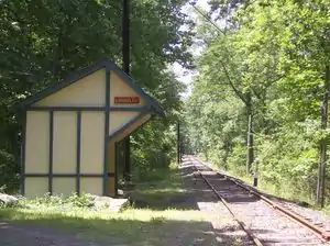![]() Locksley station shelter, c. 2010. Pennsylvania Railroad style-signage can be seen adorning the shelter. | |||||||||||||||||||||||