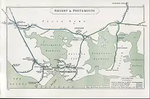 In 1853 the Direct Portsmouth Railway gained parliamentary authority to build a line from Godalming to Havant with the intention of the company selling itself either to the L&SWR or the LB&SCR. This scheme would provide a far more direct route to Portsmouth but involved sharing the LB&SCR tracks for the five miles (8 km) between Havant and the joint line to Portsea.[10] The LB&SCR objected to the scheme but the L&SWR negotiated with the new company and in December 1858 sought to operate a train over the new route. The LB&SCR attempted to prevent the use of its tracks and the so-called 'battle of Havant' ensued. The matter was eventually resolved in the courts in August 1859, and relations between the railways were formalized in agreements of 1860 and 1862.[11]