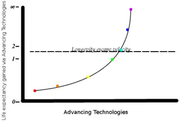 In the life extension movement, longevity escape velocity (LEV), actuarial escape velocity[2] or biological escape velocity[3] is a hypothetical situation in which one's remaining life expectancy (not life expectancy at birth) is extended longer than the time that is passing. For example, in a given year in which longevity escape velocity would be maintained, technological advances would increase people's remaining life expectancy more than the year that just went by. The term is meant as an analogy to the concept of escape velocity in physics, which is the minimum speed required for an object to indefinitely move away from a gravitational body despite the gravitational force pulling the object towards the body.