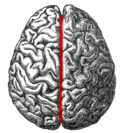 The human brain as viewed from above. Median longitudinal fissure visible in red, running top to bottom.
