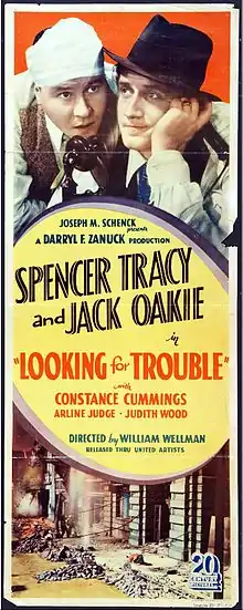 Looking for Trouble is a 1934 American Pre-Code crime film directed by William A. Wellman and starring Spencer Tracy, Jack Oakie and Constance Cummings.[1] After he is rejected by a woman, a man leaves his safe job and joins a gang that robs banks. The film features actual stock earthquake footage.