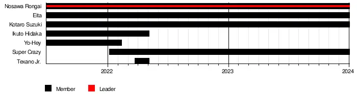 In December, Suzuki aligned himself with Rongai and his mystery partner, who later revealed to be Ikuto Hidaka. Over the following months, the trio continued their rivalry with Stinger, while also being joined by Yo-Hey in May 2021 following the disbandment of Full Throttle.[2] The following month, Dragon Gate wrestler Eita, who had previously worked in Mexican wrestling promotions and met Rongai in 2017, was revealed to be the newest member of the group.[3]