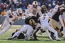 In the 1992 edition of the rivalry game, the teams' mascots Vic the Demon and Chief Brave Spirit got involved in a fight that distracted television cameras to the point that the entire altercation is caught on video. In the scuffle, Vic the Demon's head was ripped off as the two crashed to the ground behind one of the end zones, which according to the video clip, breaks a "cardinal rule", i.e. a tradition, of being a mascot. The melee was broken up by college police without further incident.[49]