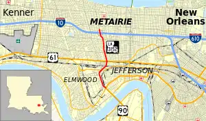 | Elmwood | 0.0 | 0.0 | Interchange; Huey P. Long Bridge across Mississippi River on the southeast | ||