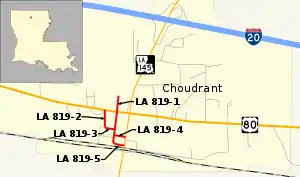 Louisiana Highway 819 (LA 819) is a collection of five state-maintained streets located in the Lincoln Parish village of Choudrant that have a total length of 0.58 miles (0.93 km).[1] All five routes were established in the 1955 Louisiana Highway renumbering[2] and are presently unsigned.