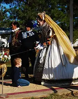 An actress (Kimberly Stockton), playing Queen Elizabeth I, knights a young visitor