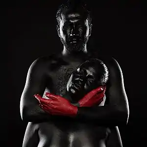 Low-key photograph using two light sources; painted bodies