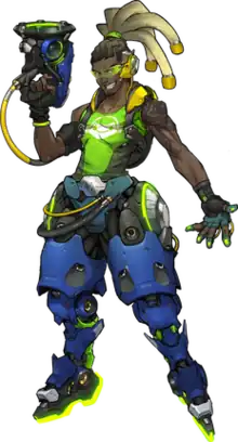 Lúcio Correia dos Santos is a black Brazilian man from Rio de Janeiro, first appearing in the 2016 first-person shooter shooter Overwatch and later its sequel. To counter the financial crisis of his area, he turned to music to lift up the spirits of his disheartened people by performing on street corners and at block parties. When the Vishkar Corporation, a multinational conglomerate, moved in to redevelop Rio, they enacted curfews and exploited citizens as cheap labor. Stealing and weaponizing Viskar's equipment, he rallied the people to rise up and drive Vishkar out of their neighborhoods. His leadership made him a global celebrity, and he began to perform in filled arenas worldwide. In Overwatch 2, due to the global threat from militant group "Null Sector", he joins the now-reformed global peacekeeping force "Overwatch" to help.[12]
