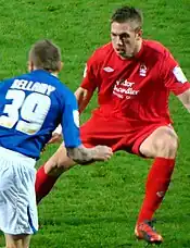He helped Northampton win promotion to League One in 2006 after finishing second in League Two during the 2005–06 season, following two consecutive seasons in the play-offs.[7] He continued to serve as a first-team regular following Northampton's promotion to League One. His only goal as a Northampton player came against Swansea City in October 2006.[8] He made 34 appearances for Northampton across all competitions during the first half of the 2006–07 season before joining Nottingham Forest in January 2007.[9]