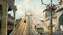Before the 1917 season, the Luna Park Amusement Company acquired additional land, which was used as a parking lot.[100] In addition, the park's managers installed the Top, a massive steel structure that was designed to resemble a spinning top.[101][102] The toboggan and burro rides were destroyed in a fire in August 1917,[103][104] and a set for a mountain range burned down in March 1918.[105] As a result of the first fire, the toboggan and burro rides were rebuilt.[100] During the 1918 season, Luna Park's managers added several attractions about World War I, including a simulated battlefield.[106][107] The next year, Luna Park installed more war-related attractions,[108] and Henry Miller was appointed as the park's general manager.[85] The park also added shows such as the Darktown Follies and A Trip to Me-Lo-Die, as well as attractions including the Frolic, Over the Top (a variant of the Virginia Reel), the Tanks, and Treat-'em-Rough.[49]