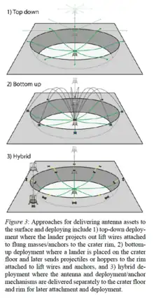 - ↑ Wang, Rebecca; Gehlot, Vinod P.; Bandyopadhyay, Saptarshi; McGarey, Patrick M.; Byron, Benjamin; Pisanti, Dario; Wilson, Ron; Jenks, Kenneth (23 January 2023). "Lift Wire Deployment and Anchoring System for the Lunar Crater Radio Telescope on the Far Side of the Moon". AIAA SCITECH 2023 Forum. American Institute of Aeronautics and Astronautics. doi:10.2514/6.2023-1787. ISBN 978-1-62410-699-6. S2CID 256134317.