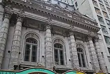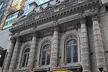 The primary elevation of the facade is on 45th Street and is made of limestone.[1][12][13] A promotional brochure from the theater's opening in 1903 said that the facade "recalls in its style and amplitude the best period of Roman art".[14] The street-level facade is made of rusticated blocks of limestone.[15] Three large archways lead into the lobby;[16][17] their doors are made of painted wood and contain arched panels of glass.[18] The street level entrances are shielded by a sinuous marquee canopy made of iron and glass.[19][20] When the theater opened, the entrance had a self-supporting canopy that could shield either five[17] or eight carriages unloading their passengers.[13][16] In 1986, the canopy was replaced with a replica that was cantilevered from the facade with metal rods. The modern canopy has moldings of pressed metal, medallions above each archway, and glass panels hanging underneath the canopy.[19] The design of the Lyceum's canopy was subsequently replicated by that of the Paramount Theatre.[21][lower-alpha 1]