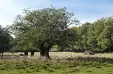 Jægersborg Dyrehave is a forest park located in the eastern part of Lyngby-Taarbæk Municipality, bordering Taarbæk to the east. The amusement park Dyrehavsbakken is located in the southern part of the park. The park spans 11 km2 and is home to around 2000 red and fallow deer. There are 19 gates to the park, all of them painted a characteristic red. The current design of the gates date back to the 1700s. The park is home to many old oaks, the oldest being around 850 years old and known as Skovfogedegen (literally "forest ranger oak"), named such because it is located next to the forest ranger house Klampehus. The oak is hollow, and has throughout history been used for many things, including church ceremonies and as a shed for peat. Another oak is named Christian V's Oak, named such because Christian V suffered his fatal hunting injury nearby, when he was kicked by a wounded deer. Another old oak is named Ulvedalsegen and is around 600—700 years old. The park is also home to hawthorn, most of it naturally occurring. In the park is a mass grave from the Black Death victims from the 1600s and 1700s. These graves have been planted with hawthorn.[11]