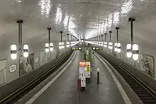 For the station, as well as for the station Leipziger Platz, Grenander chose the color code green, because its color scheme for this distance provided for a regular repetition of the colors.[2] The station, which has a small mezzanine floor at each end, received a 121.3 meters long and 7.6 meters wide central platform.