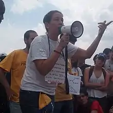 ![]() Kräuter giving a lecture about tear gas during a sit in, in Caracas, 2017 | |