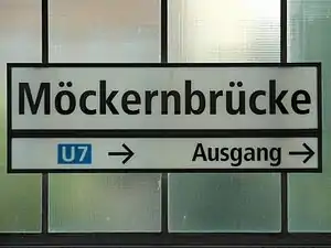 Möckernbrücke is a station of the Berlin U-Bahn network in the western Kreuzberg district, in the vicinity of Potsdamer Platz, named after a nearby bridge crossing the Landwehrkanal. It is served by lines U1, U3, and U7.