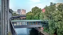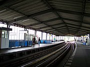 In the course of the extension of the U7 from Mehringdamm to the west, a twin underground station was built at the southern shore of the Landwehrkanal. The U7 platform opened on 28 February 1966 (architect Rümmler) [2] Möckernbrücke became the line's western terminus until the second continuation to Fehrbelliner Platz on 29 January 1971. The U1/U3 and U7 platforms are connected by a glazed bridge over the Landwehrkanal.