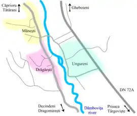 It is composed of three villages: Drăgăești-Pământeni (colloquially "Drăgăești"), Drăgăești-Ungureni (colloquially "Ungureni") and Mănești. Mănești and Drăgăești are on the right bank of the Dâmbovița River, while Ungureni is on the left bank.
