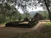 King Bhadravarman caused a stele to be erected at Mỹ Sơn the inscription on which recorded his foundation. The stele indicates that the king dedicated the entire valley of Mỹ Sơn to Bhadreśvara. The text ends with a plea from Bhadravarman to his successors: "Out of compassion for me do not destroy what I have given."[8]:29 Drawing upon the doctrines of saṃsāra and karma, he added, "If you destroy [my foundation], all your good deeds in your different births shall be mine, and all the bad deeds done by me shall be yours. If, on the contrary, you properly maintain the endowment, the merit shall belong to you alone."[9] Bhadravarman's successors heard his plea, it seems, for Mỹ Sơn became the religious hub of Champa for many generations.