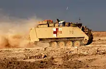 In accordance with the terms of the Geneva Conventions regarding the treatment and transportation of wounded personnel, these vehicles are required to be unarmed and their non-combatant role indicated by large red crosses on a white background painted on their exterior.[3] Medical personnel are permitted to carry small arms for the purpose of defending themselves and their patients.