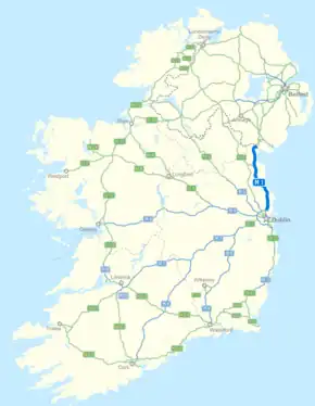 Almost the entire length of the N1 has been upgraded to motorway standard and is designated the M1 motorway. It runs from the Junction 3 of the M50 ring road in Dublin, past Cloghran, Swords, Balbriggan, Stamullen, Drogheda, Dunleer, Castlebellingham and Dundalk before ending at Ballymascanlon north of Dundalk. It by-passes many towns and villages through which the N1 travelled.[1] The original N1 route now forms the R132.[2] At Ballymascanlon, it becomes the N1 dual carriageway and continues to the border with Northern Ireland. The motorway section of the N1 uses the M1 designation. Small yellow route markers along the motorway route also read N1.