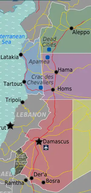The M5 Motorway is the most important motorway in Syria due to its length and function as the country network's south-north backbone. It is known as the "International Road."[1] It connects the border with Jordan in the south with Damascus, the country's political capital, and continues further north through Aleppo, the country's economic capital and second largest city, to the border with Turkey in the north.[1][2]