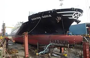 ![]() The MV Maersk Rubicon, then known as the Hanjin Aqua drydocked in Singapore in February 2016. | |