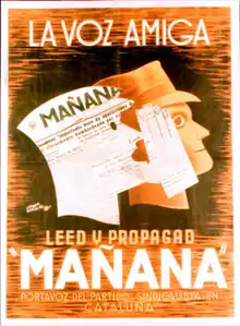 Mañana (meaning Morning in Spanish) was the regional mouthpiece of the Catalan Federation of the Syndicalist Party in Catalonia, Spain.[1][2] It was published daily from Barcelona.[2] The paper was published between 1937 and 1939.[1][2][3] Together with El Sindicalista, it was the most prominent publication of the party.[4] It was printed at the printing shop that had previously issued El Correo Catalán.[5]