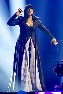 The Macedonian performance featured Kaliopi performing in a long black and white dress, designed by Roze Trajcevska, at the centre of the stage flanked by four backing vocalists on one side and a drummer on the other side.[24][25][26] The stage colours were predominately black and white with the background LED screens displaying red designs during the final chorus. The drummer that joined Kaliopi on stage was Goran Mihajlovski and the four backing vocalists were Maja Sazdanovska, Marija Naumovska, Julija Karamitrova-Ognenoska and Kalina Velkovska.[27]