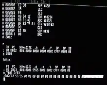 Machine language monitor in a W65C816S single-board computer, displaying code disassembly, as well as processor register and memory dumps