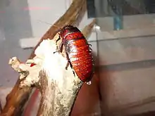 The Madagascar hissing cockroach (Gromphadorhina portentosa), also known as the hissing cockroach or simply hisser, is one of the largest species of cockroach, reaching 5 to 7.5 centimetres (2 to 3 inches) at maturity. They are native to the island of Madagascar, which is off the African mainland, where they are commonly found in rotting logs. It is one of some 20 known species of large hissing roaches from Madagascar, many of which are kept as pets, and often confused with one another by pet dealers; in particular, G. portentosa is commonly confused with G. oblongonota[1] and G. picea.[2]