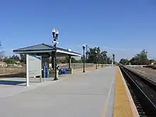 In August 2010, ground was broken on this new station. The grand opening of the new Amtrak station took place on November 4, 2010,[8] with regular service beginning the 8th. The $2 million station project, which included a new platform, shelter, lighting, access road and landscaping, involved the city of Madera, Amtrak, BNSF Railway and Caltrans. Funding came from Madera County's “Measure T,” a ½ cent transportation improvement sales tax, the state of California and the California Transportation Commission.[4] Over the next three years, the new station saw a nearly 25% increase in ridership[9] and received additional improvements to the station, including solar panels.[10][11] Nearly all evidence of the former Madera (Storey) station has been entirely removed.