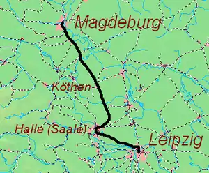 The Magdeburg–Leipzig railway is a double-track, electrified railway in the German states of Saxony-Anhalt and Saxony, connecting Magdeburg via Köthen and Halle to Leipzig.