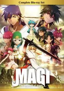 Magi: The Labyrinth of Magic is a Japanese anime television series based on the manga series of the same title written and illustrated by Shinobu Ohtaka. Produced by A-1 Pictures, it began airing in Japan on October 7, 2012.[1] It also debuted in North America on October 10 on Crunchyroll and Hulu.[2] The series is licensed by Aniplex of America in North America,[3] by Viz Media Europe in Europe[4] and by Madman Entertainment in Australia.[5] From episodes 1–12, the opening theme song is "V.I.P." by SID and the ending theme song is "Yubi Bōenkyō" by Nogizaka46.[6] From episode 13 onwards, the opening song is "Matataku Hoshi no Shita de" by Porno Graffitti and the ending is "The Bravery" by Supercell.[7][8]