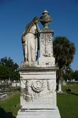 The Pomeroy family mausoleum is one of two cast iron over brick mausoleums in the cemetery.[5] The Rouse monument is a Neoclassical style monument with a classically robed mourning woman placed beneath a low profiled gable supported at the four corners by columns.[5] The Confederate Rest section of the cemetery contains 1100 war dead and many large, elaborate monuments and includes an obelisk commemorating the men who died on the Confederate submarine H.L. Hunley.[5] The Jewish Cemetery contains many simple styles with Hebrew inscriptions, in addition to some of the more elaborate plots within the cemetery.[5] The Caldwell mausoleum is an example of a Gothic Revival style mausoleum. It contains a lifesize interior angel.[5] The Wilson mausoleum, by contrast, is in an example of Egyptian Revival style and features an interior wall with stained glass.[5] The LeBlanc memorial is dedicated to two sisters who died in infancy and whose grandmother commissioned the small Neo-Renaissance statuary of two putti leaning together over a stone marker. It is one of the most photographed markers in the cemetery.[5] The Bellingrath-Morse monument is a classical semicircular Doric colonnade and is one of the tallest monuments within the grounds.[5] The Mobile National Cemetery annex includes a Second Empire-style gatehouse and a brick stable built in the 1880s.[4] This annex contains over 5000 burials and a monument for the 76th Illinois Volunteer Infantry Regiment.[11] The monument was erected in 1892 by the Union Army survivors of the Battle of Fort Blakely.[11] The annex also contains the graves of thirteen Apaches who were held as prisoners nearby at Mount Vernon Arsenal between 1887 and 1894 by the Federal government.[5][11]
