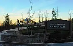 Magnolia Park is 3.11 acres (12,600 m2) in size and is the city's easternmost park.[5] The park is located in the Tanasbourne neighborhood and was adopted by the Trader Joe's store as part of Hillsboro's adopt-a-park program.[5] Magnolia is between Cornell and Walker roads and surrounded by a retail development that includes Whole Foods, a retirement community, and condominiums.[3] Amenities at the park include a water fountain designed for children to play in,[6] walking areas, open grass areas, children's play equipment, athletic equipment, natural areas, and a covered picnic area.[7]