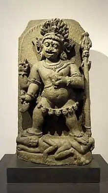 Mahakala is also known as Mahakala Bhairava in Hinduism,[8] and many temples in India and Nepal are dedicated solely for Mahakala Bhairava, for example at the temple in Ujjain, which is mentioned more than once by Kālidāsa. The primary temple, place of worship for Mahakala is Ujjain. Mahakala is also a name of one of Shiva's principal attendants (Sanskrit: gaṇa),[9] along with Nandi, Shiva's mount and so is often represented outside the main doorway of early Hindu temples.