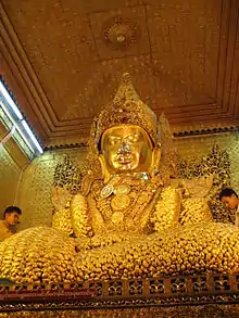 The Mahamuni Buddha Temple (Burmese: မဟာမုနိရှင်တော်မြတ်ကြီး, Burmese pronunciation: [məhà mṵnḭ pʰəjádʑí]) is a Buddhist temple and major pilgrimage site, located southwest of Mandalay, Myanmar (Burma).[1] The Mahamuni Image (lit.'The Great Sage') is enshrined in this temple, and originally came from Arakan.[2] It is highly venerated in Burma and central to many people's lives, as it is seen as an expression of representing the Buddha's life.[3]